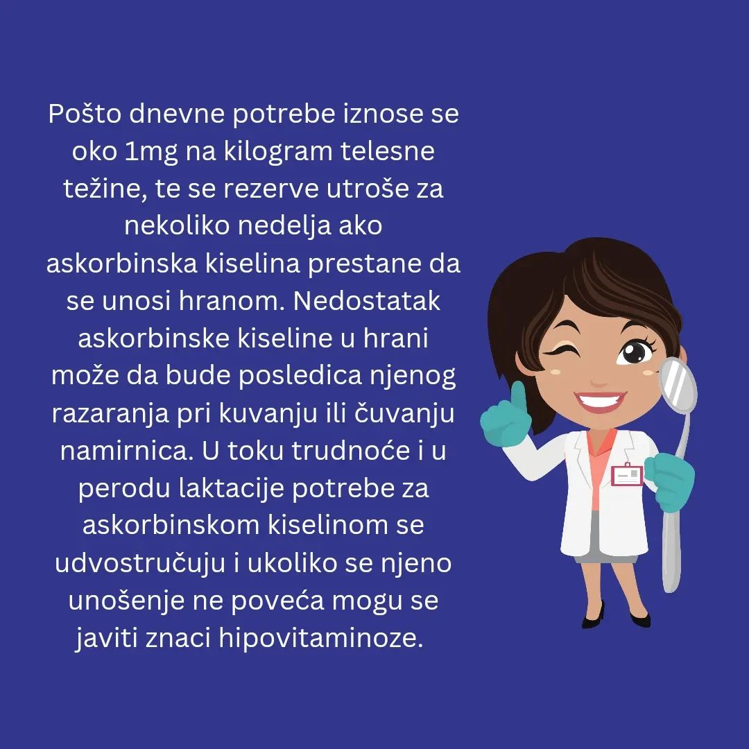 Vitamin C predstavlja antioksidant koji štiti ćelije u organizmu od oštećenja, ali učestvuje i u brojnim reakcijama u organizmu. Vitamin C je kofaktor u metabolizmu tirozina, holesterola i sinteze karnitina, neurotransmitera, peptidnih hormona, kortikosteroida, i aldosterona. Učestvuje u normalnom procesu apsorcije gvoždja iz organa digestivnog trakta, za sintezu hemoglobina i metabolizam folne kiseline, i učestvuje u procesu sinteze kolagena u organizmu.